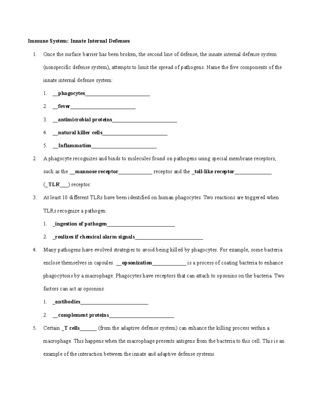 Immune IP Innate Internal Defenses Worksheet Immune System: Innate