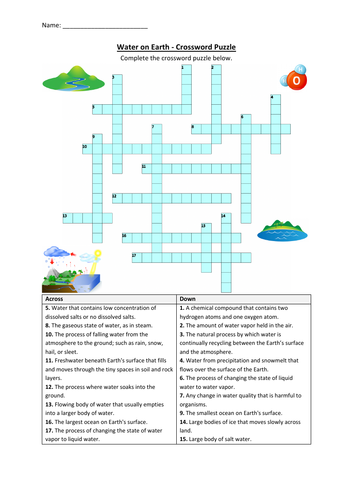 Water on Earth Crossword Puzzle Worksheet Activity (Printable