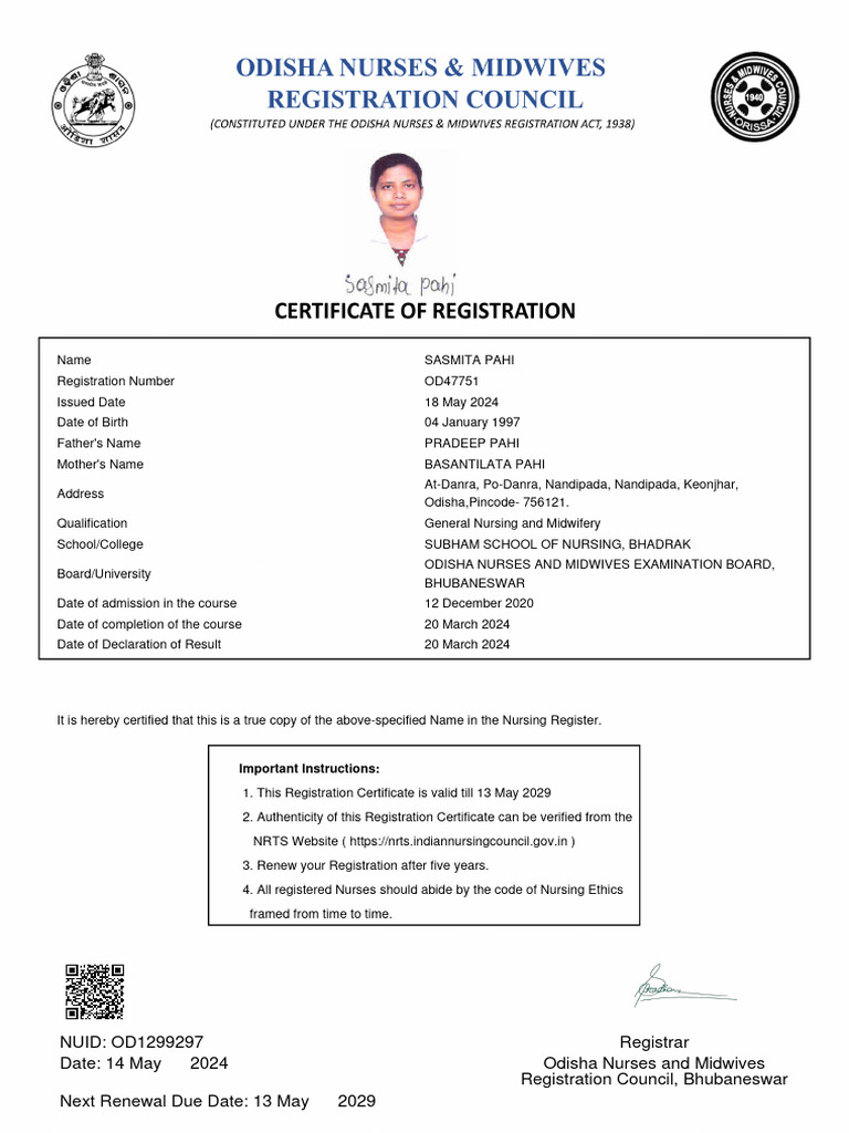 NUID: OD1299297 Registrar Date: 14 May 2024 Odisha Nurses and Midwives