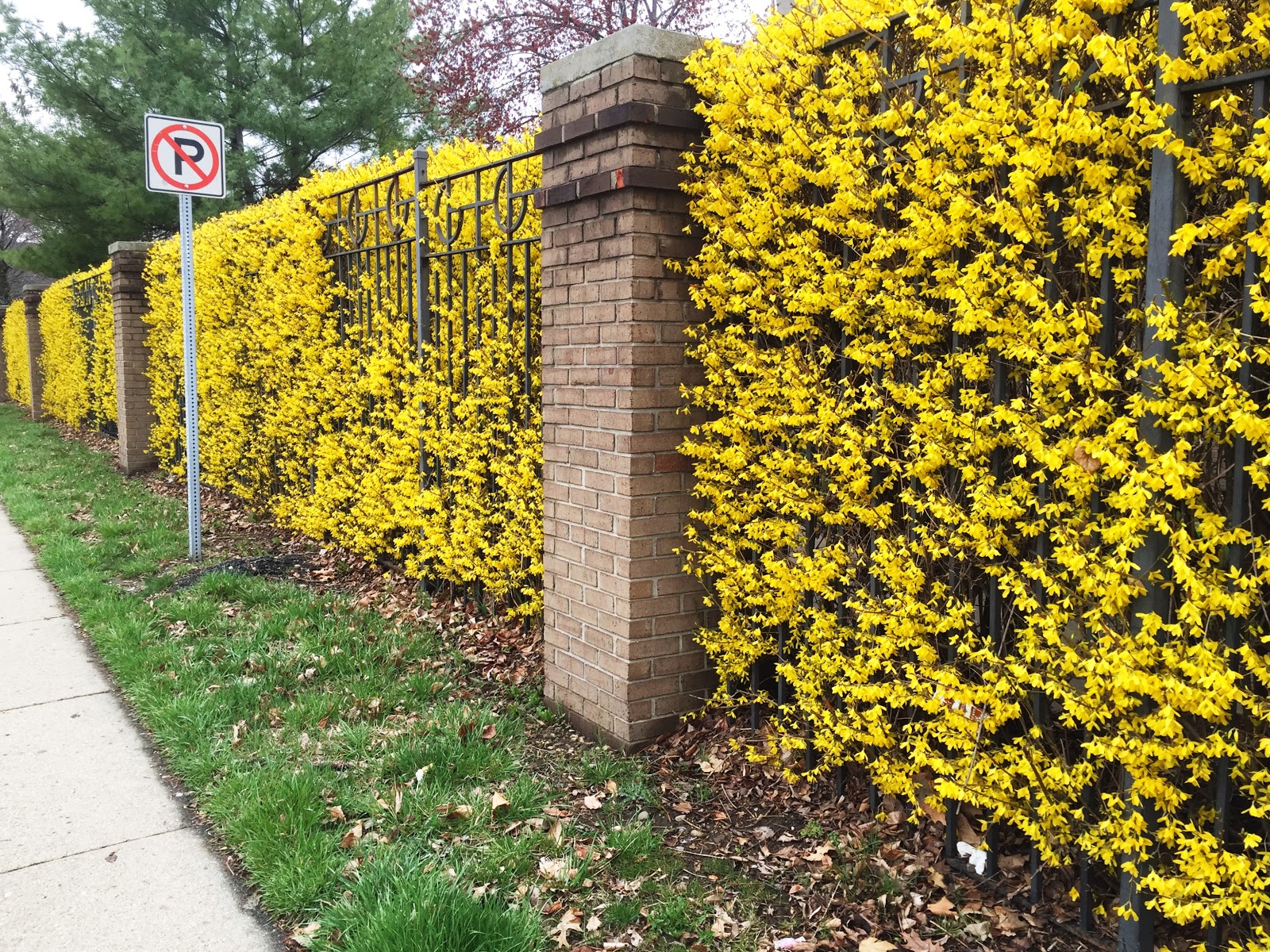 An Entire Wall of Yellow Flowering Forsythia in Hedge Form Backyard