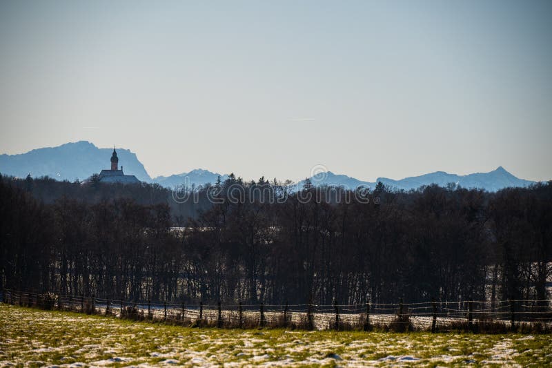 Monastery Andechs and Bavarian Alps with Zugspitze Highest Mountain in