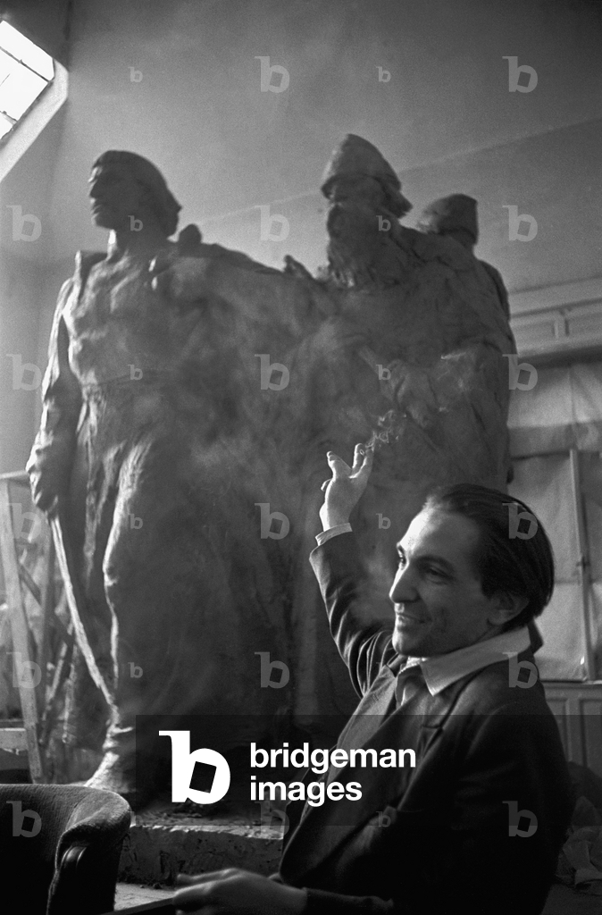 Image of Istvan Kiss sculptor showing his model for a monument To by