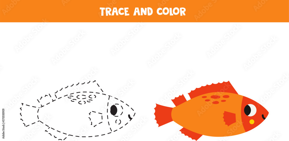 Trace and color cartoon cute sea bass Worksheet for children Stock