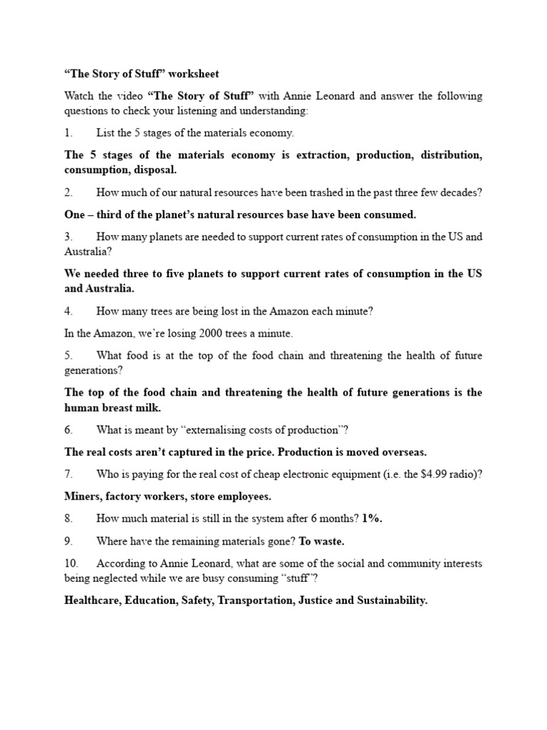 The Story Of Stuff Worksheet Answers