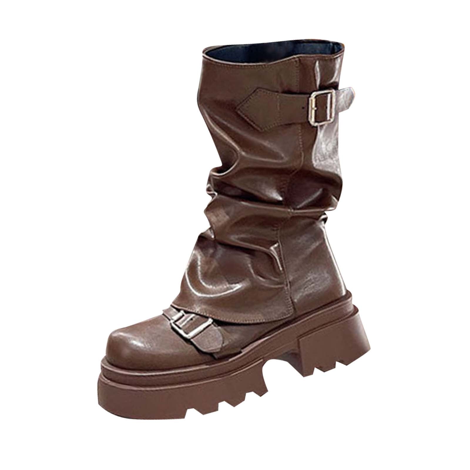 Brown Women Mid Heel Mid Calf Boots Belt Buckle Thick Heel Thick Sole