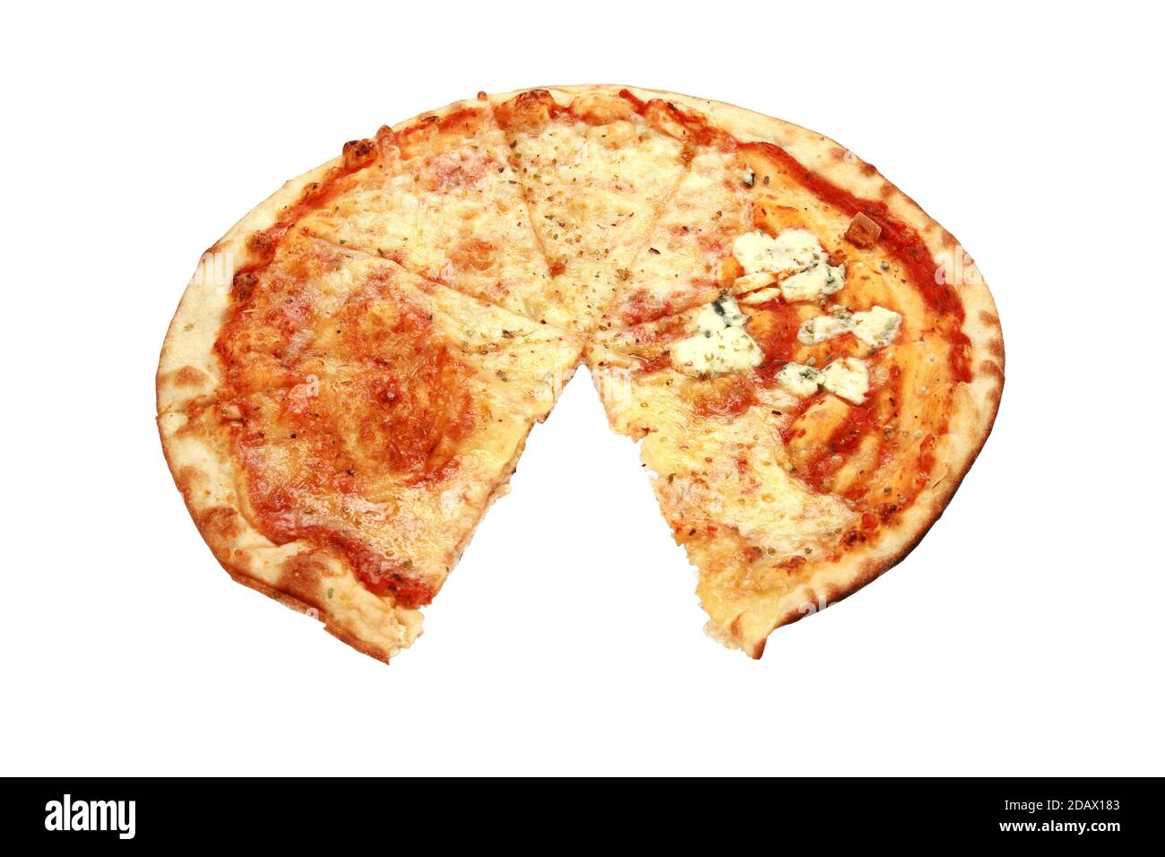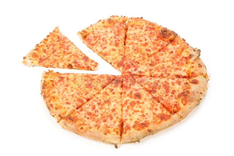 Cut pizza with one piece missing isolated on a white background Stock