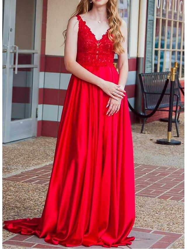 A Line Prom Dresses Floral Dress Party Wear Court Train Sleeveless V
