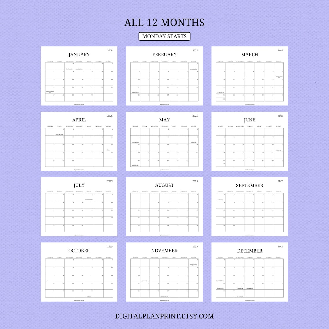 Printable 2025 Calendar with Holidays (12 month on one page)
