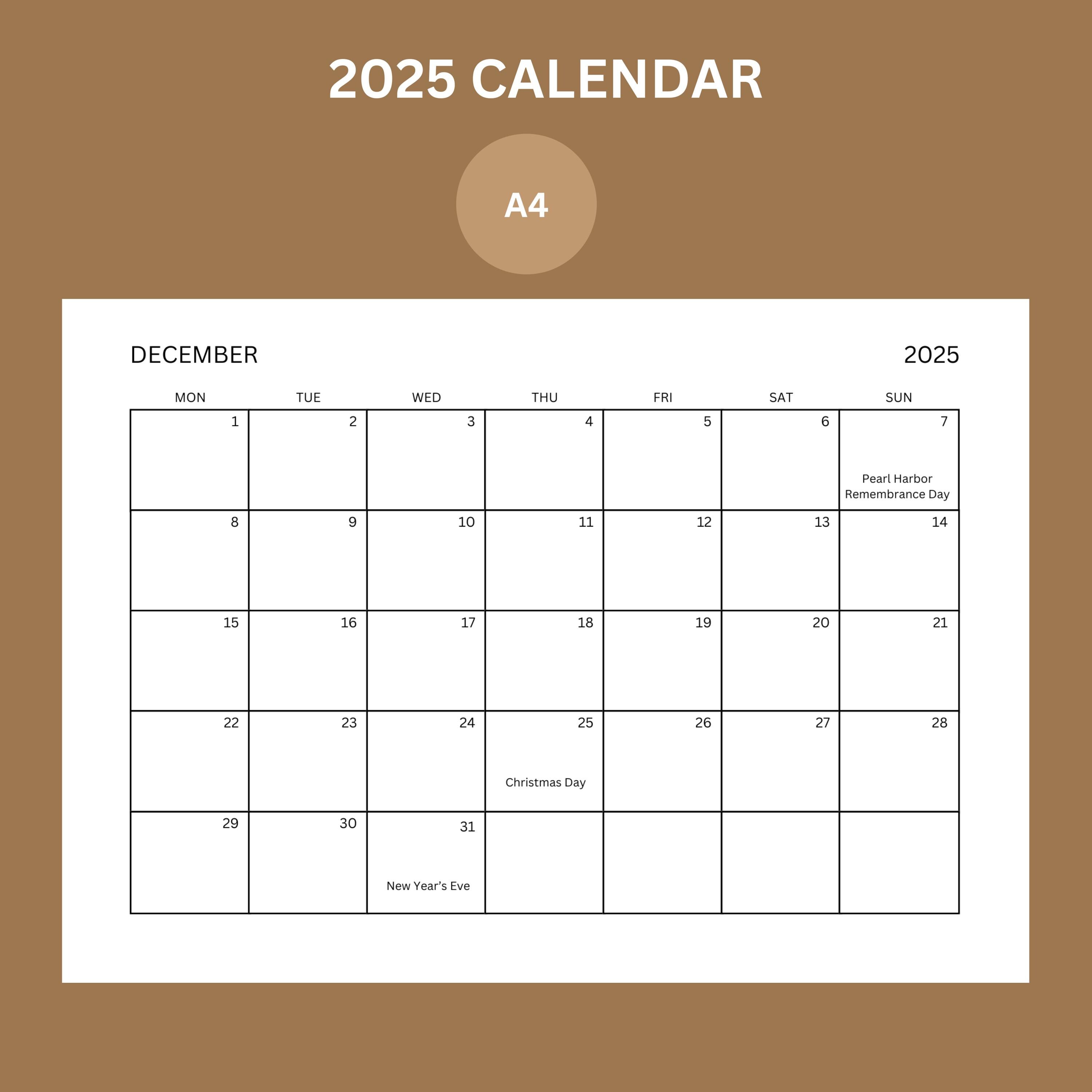 Monthly calendar template for 2025 year Wall or desk calendar in a