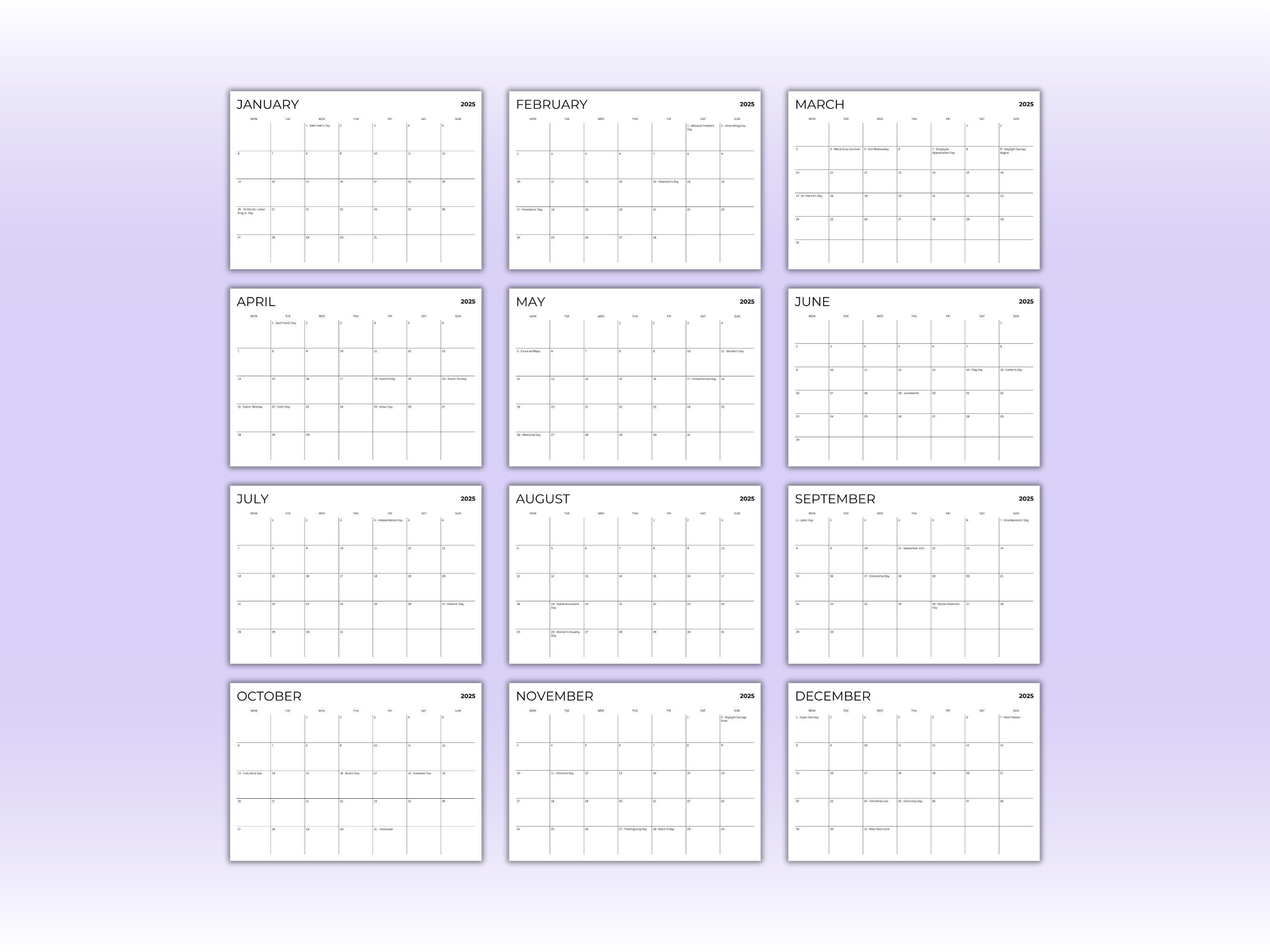 2025 Printable Monthly Calendar With Holidays US Landscape Modern