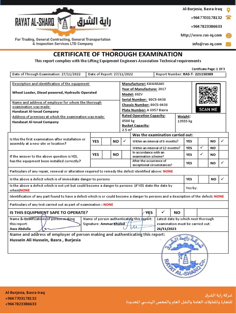 Certificate of Test and Thorough Examination For Loose Lifting Gear and