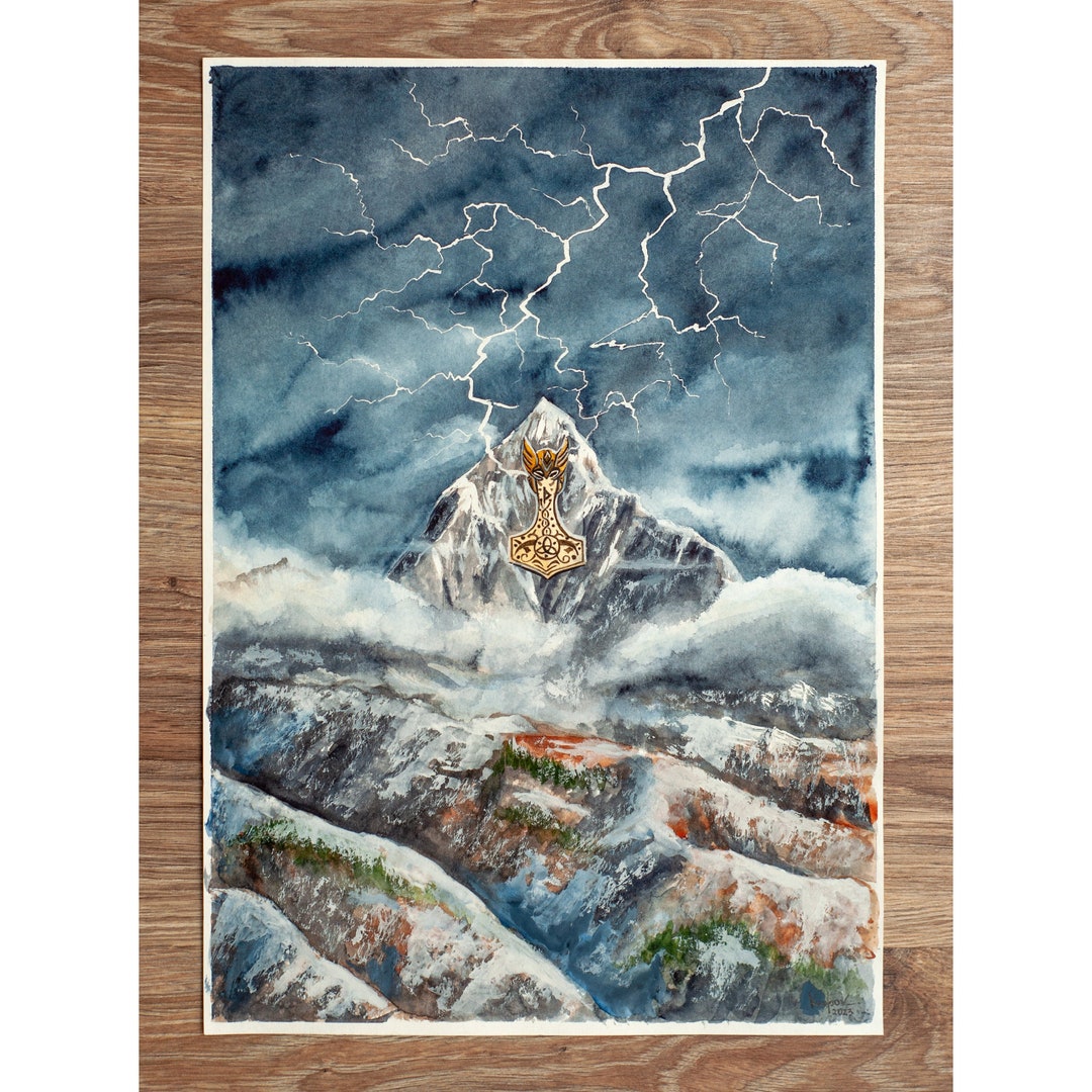 Original Watercolor Hummer of Thor Mountain Painting Thors Mjölnir