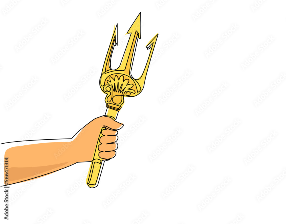 Single one line drawing hand holding trident Three pronged spear