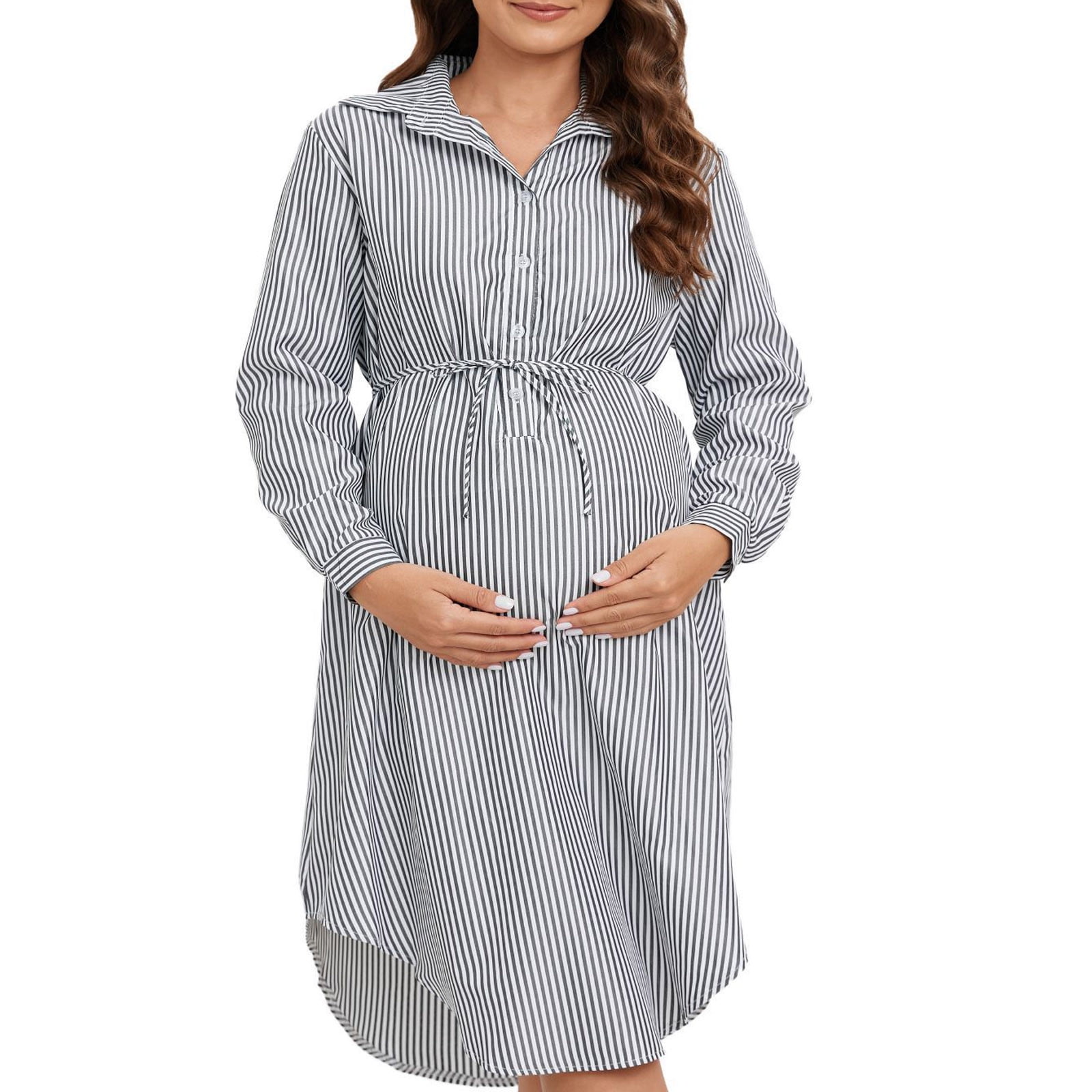 Annhoo Women #39 s Maternity Button Down Dress Collared Striped Long Sleeve