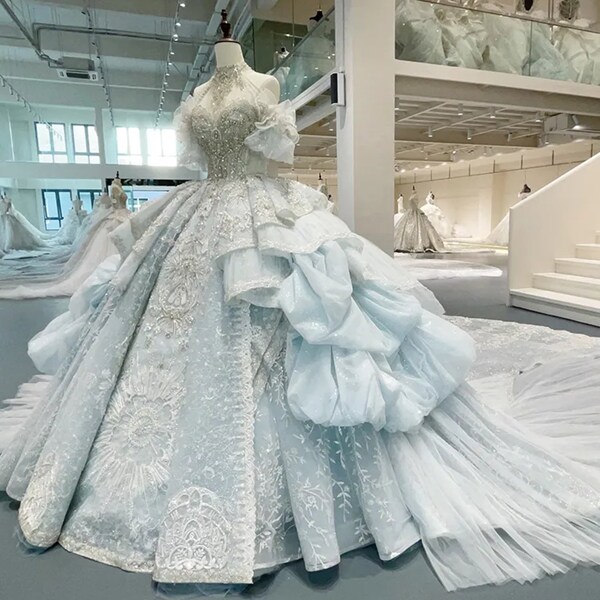 Huge blue ruffles gown with puffed sleeves Haute couture Couture