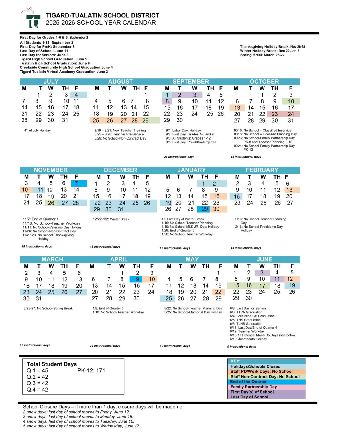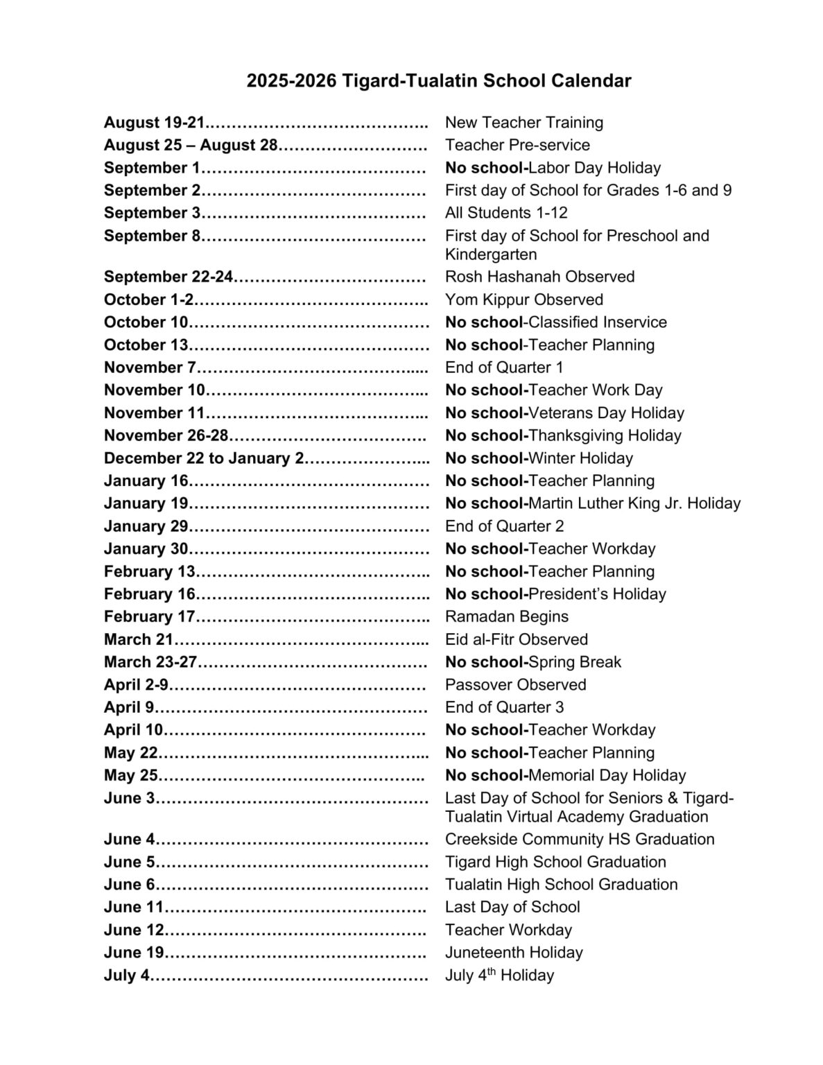 TIGARD TUALATIN SCHOOL DISTRICT OR Calendar 25 26 Revised pdf EduCounty