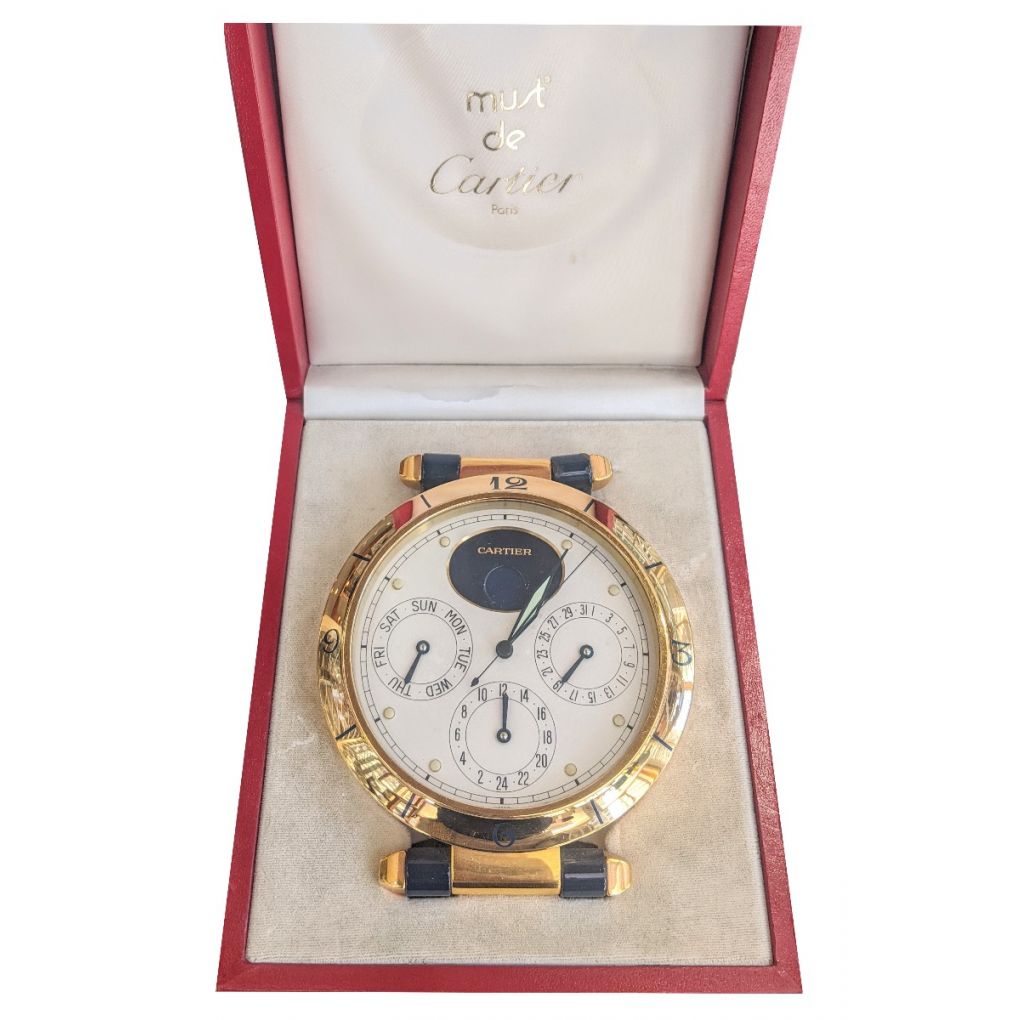 Cartier Pasha Duel Time Zone Calendar Desk Clock with Moon Phase Van Rijk