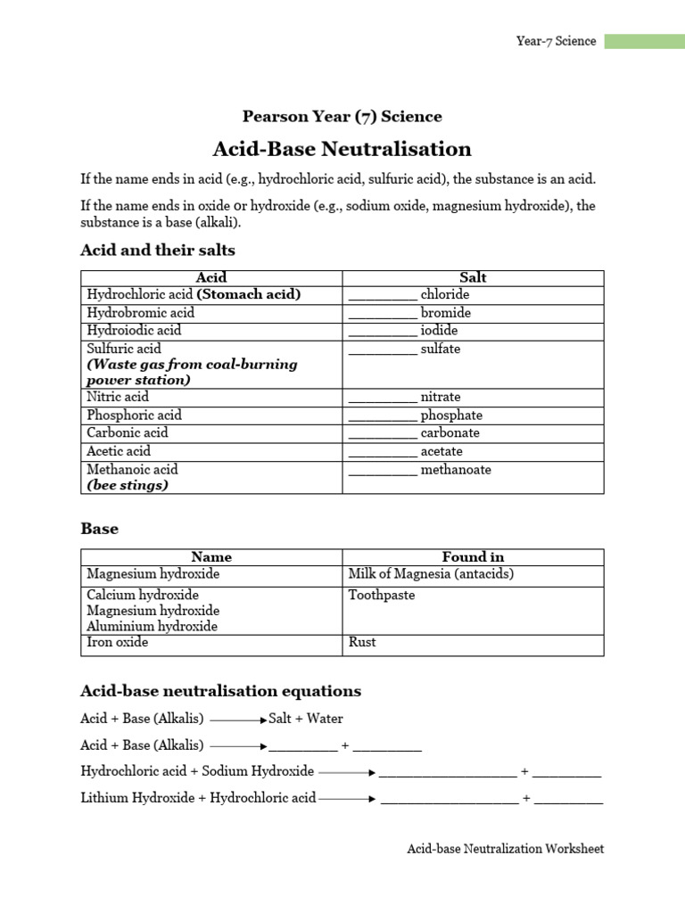 Neutralization Worksheet: Acids Alkalis pH Scale