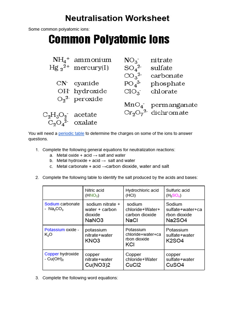 Chemistry Writing Equations For Neutralization Reactions Worksheet