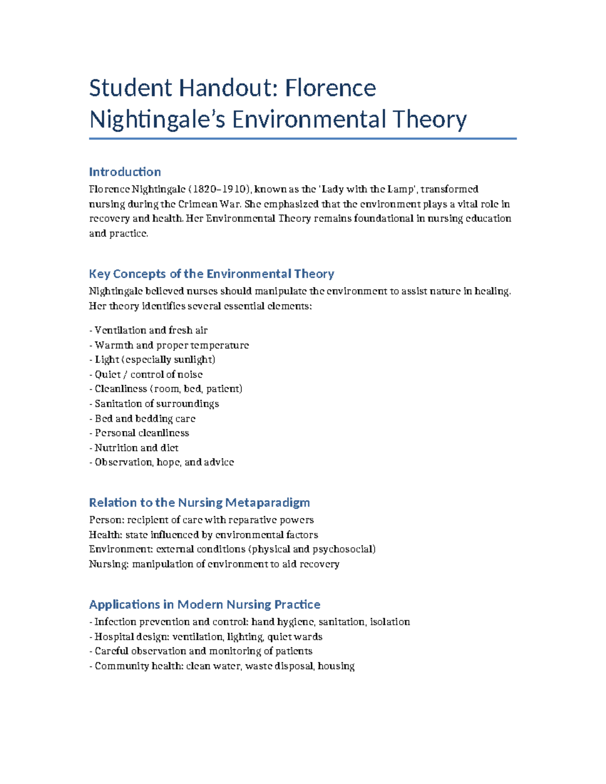 NUR 101: Nightingale #39 s Environmental Theory Handout Studocu
