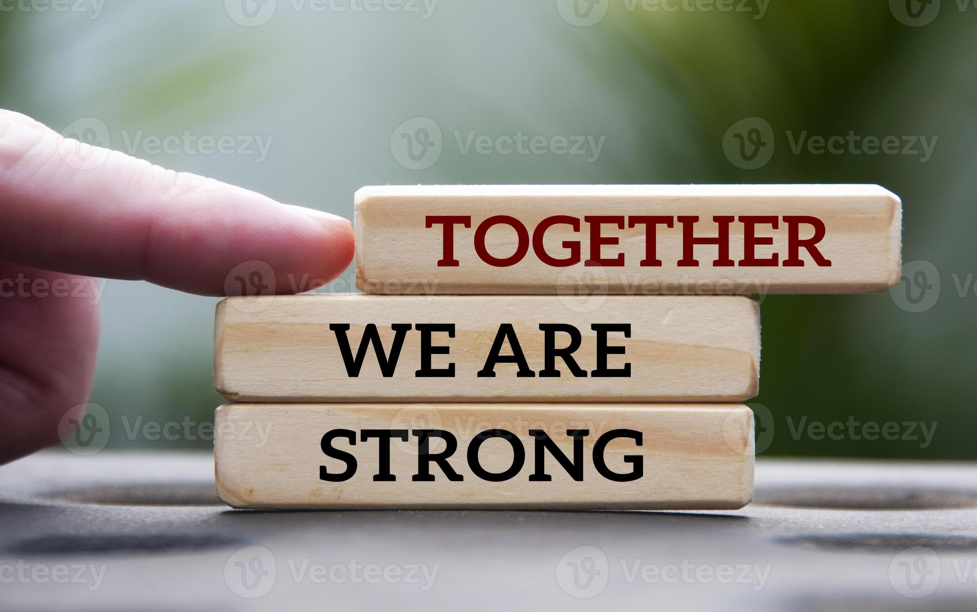 Finger pointing together we are strong text on wooden blocks with