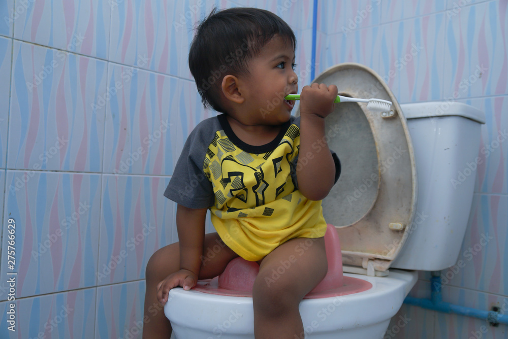 Cute little asian boy sitting on the toilet Baby constipation Concept