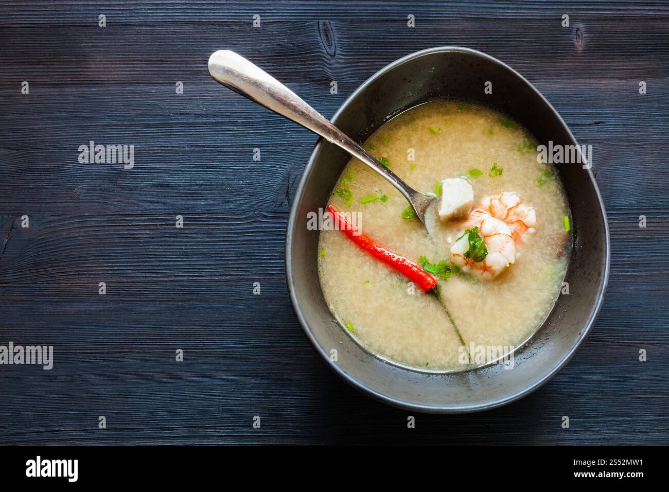 Thai cuisine dish above view of bowl with Tom Kha Thale (Tom kha kai