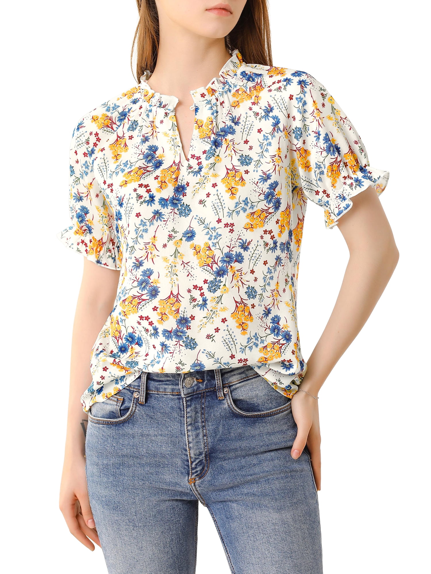 DARING DIVA Women #39 s Floral Ruffled Neck Short Sleeves Top Blouse M
