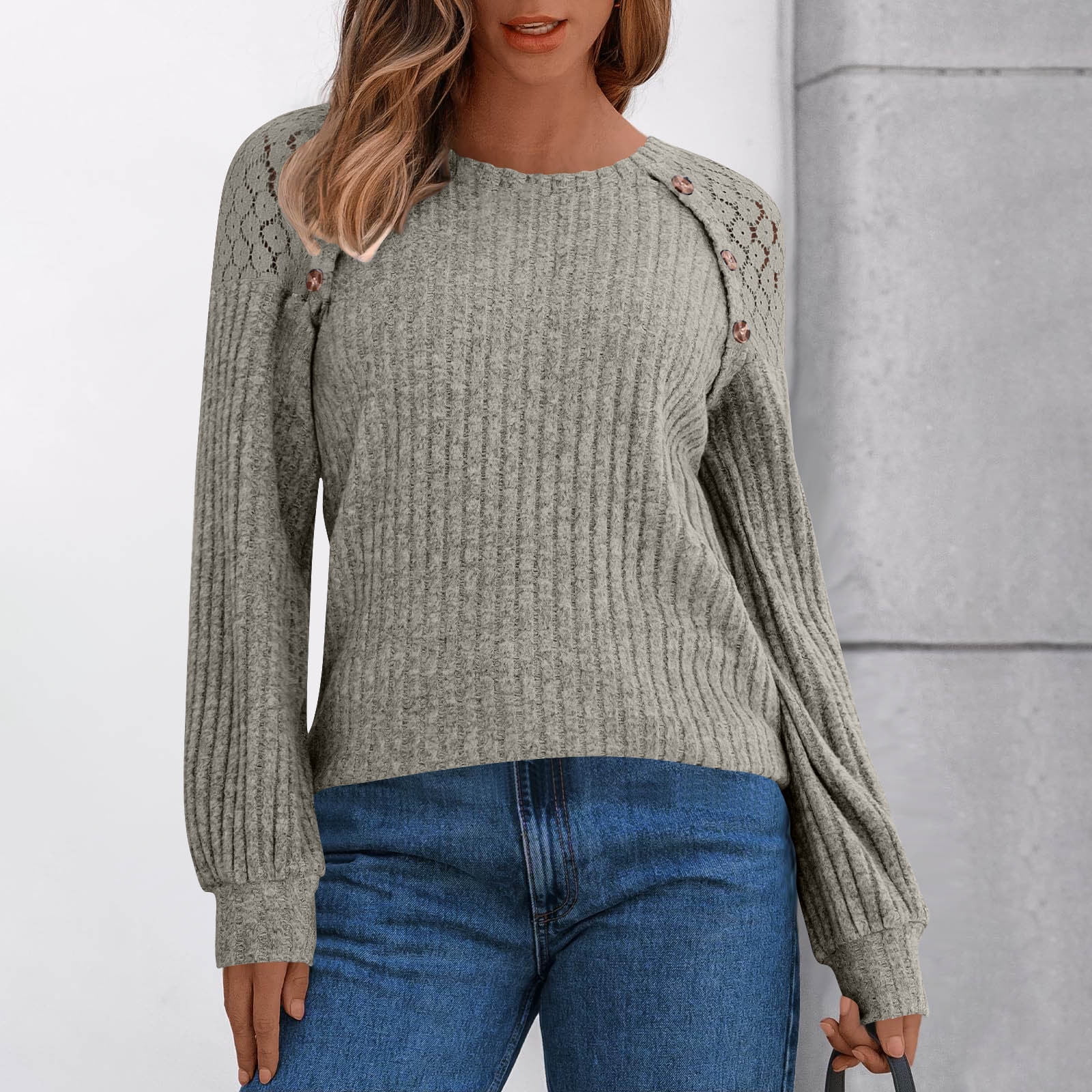 Delliss Women #39 s Long Sleeve Round Neck Lace Patchwork Solid Color Top