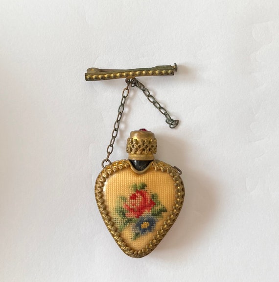Vintage Petit Point Perfume Bottle 1950s Gold Filigree Rose Design