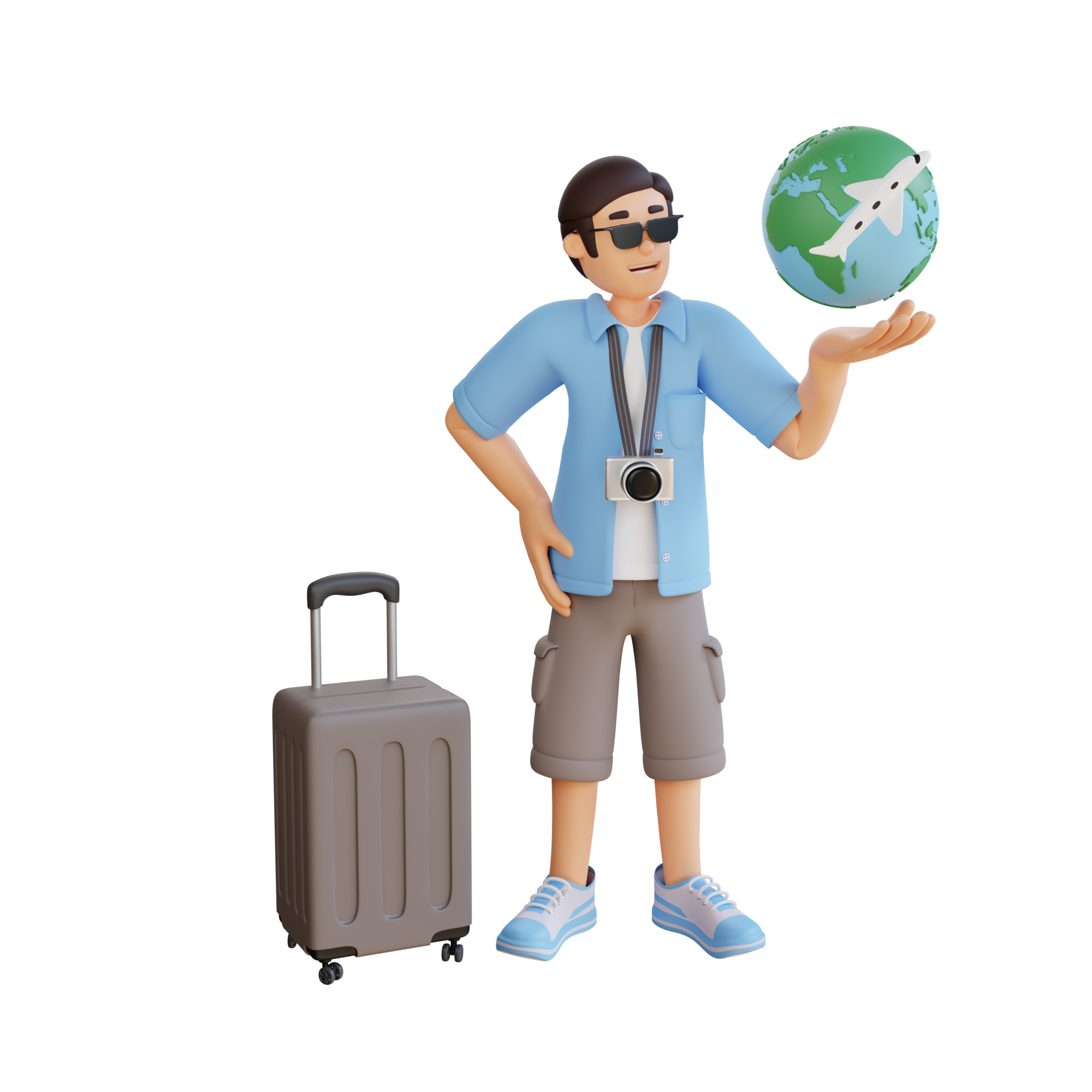 male tourist with suitcase and globe 3d character illustration 11382000 PNG