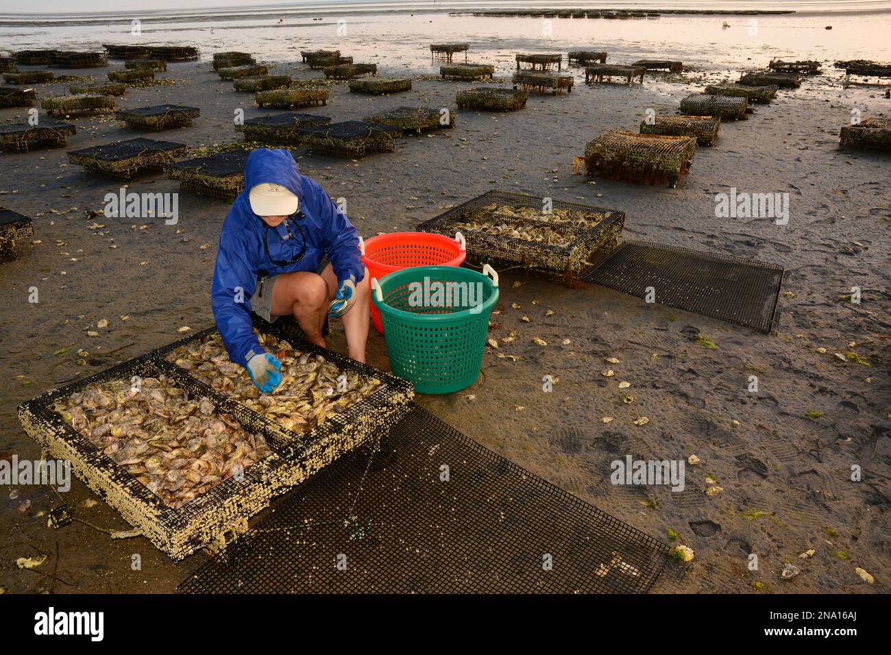 A woman collects oysters from the Brewster Town oyster beds Stock Photo