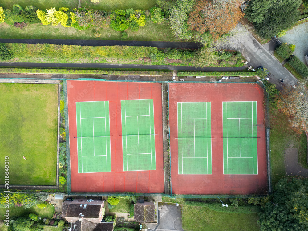 Four side by side public tennis courts seen in a typical British town