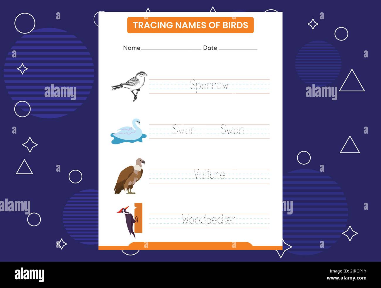 Trace the names of birds Handwriting practice for preschool kids Stock