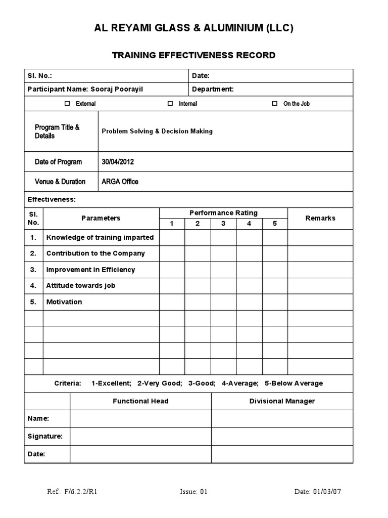 Training Effectiveness Record PDF Motivational Motivation