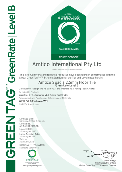 Spacia LVT Greenrate Level B Certificate Amtico International NBS