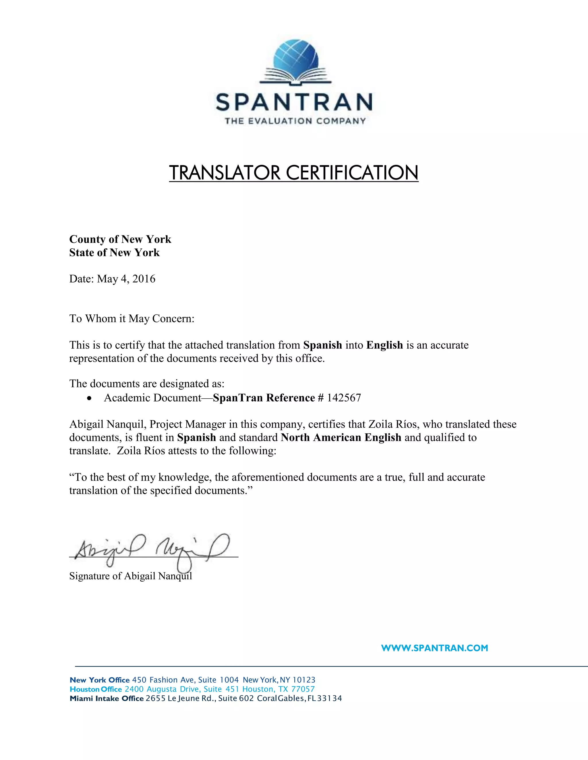 Translation Certificate Texas A M University Corpus Christi