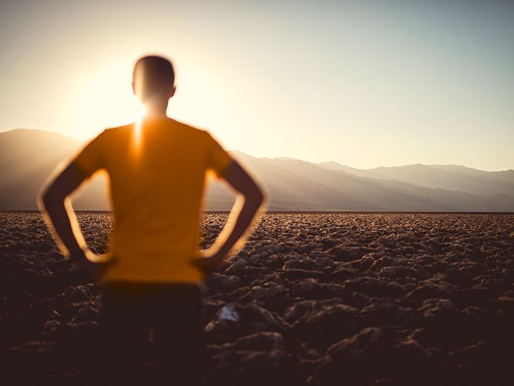Man Stands on the Peak of Sandstone Rock Watching Over Valley To Sun