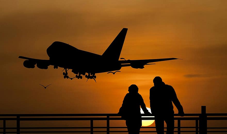 Silhouette of People Watching Taking Pictures of Airplane Flying