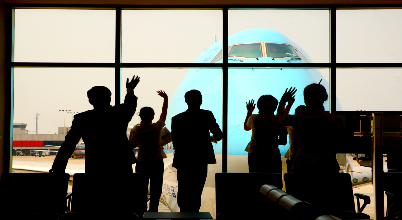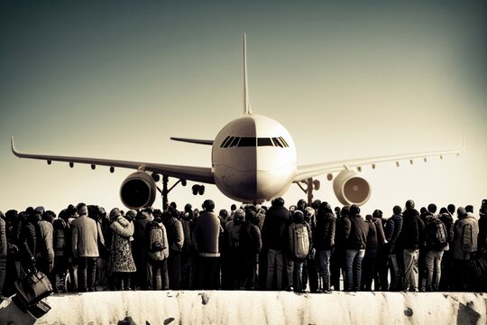 Group of Silhouettes People Watching Commercial Airplane Taking Off