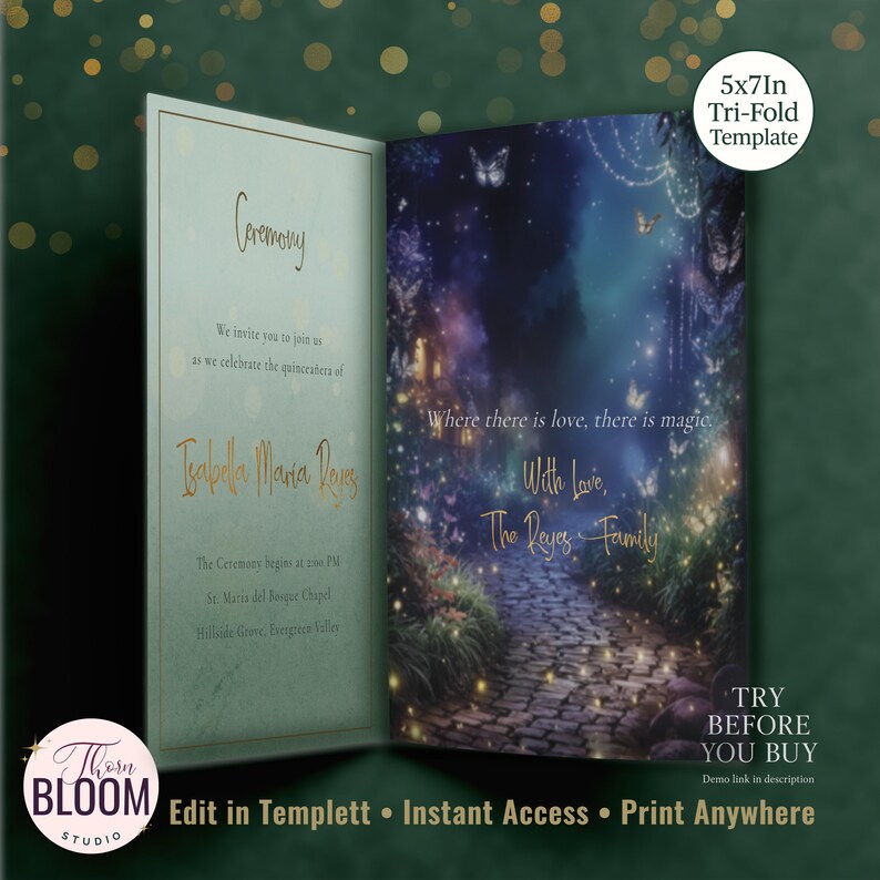 Enchanted Forest Quinceañera Invitation Tri Fold Fantasy Editable