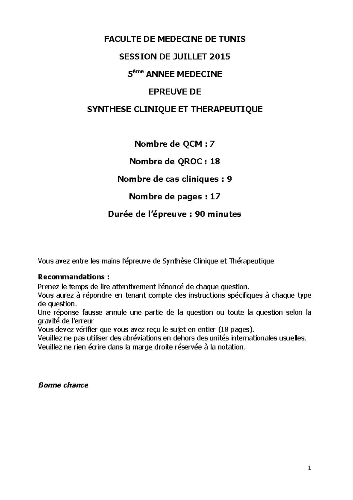 Therapeutque Jui 2015 Cours FACULTE DE MEDECINE DE TUNIS SESSION DE