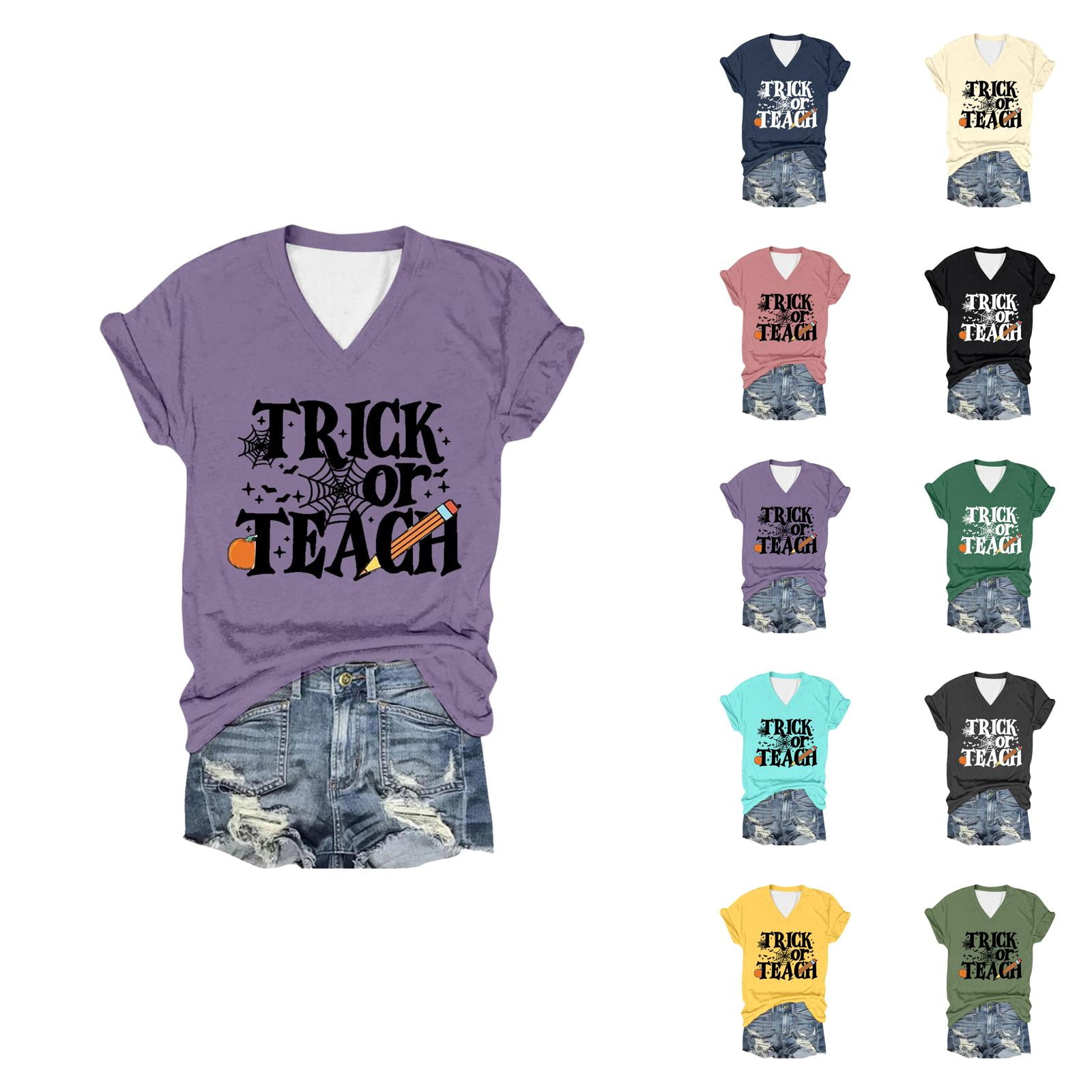 Trick Or Teach Halloween Teacher Tshirts Women 2025 Short Sleeve V Neck