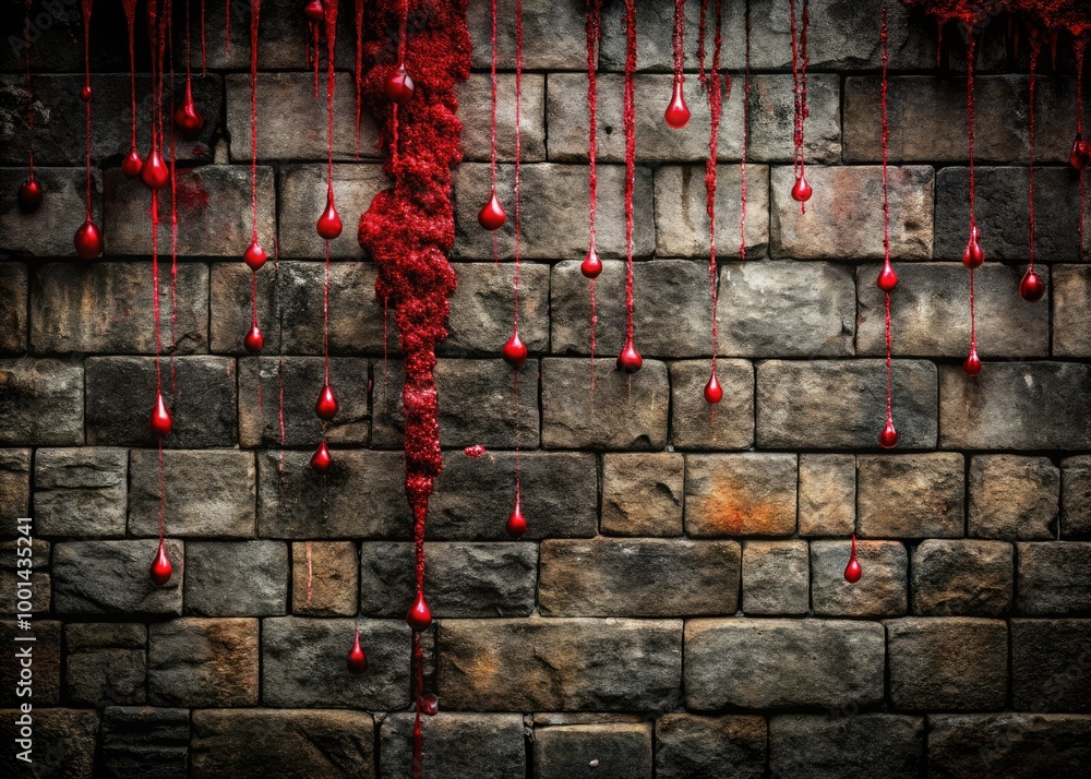 Gloomy crimson droplets trickle slowly down a worn stone like wall