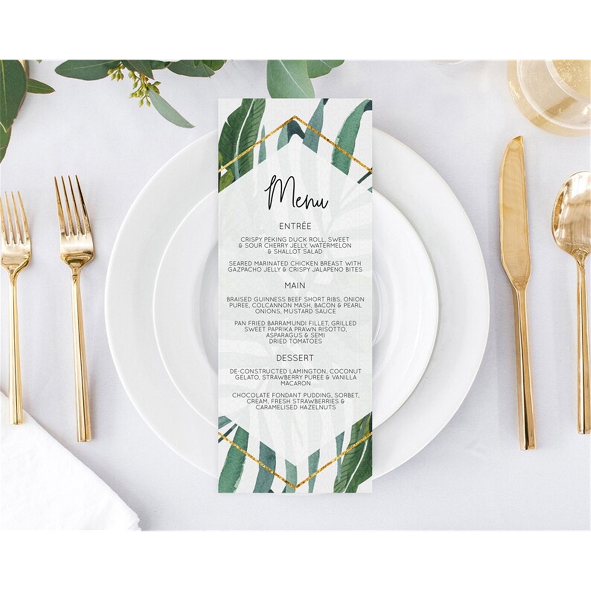 Tropical Menu Template Palm Greenery and Gold Wedding Menu Card
