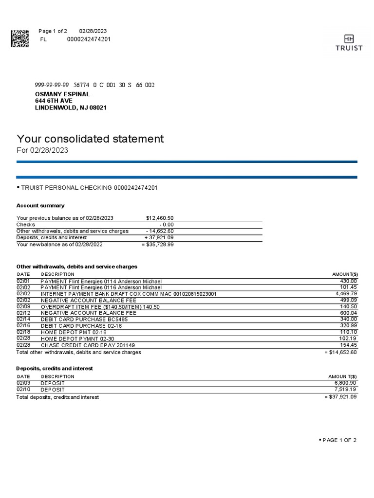 Truist Bank Account Statement: Check Balance Deposits and Course Hero
