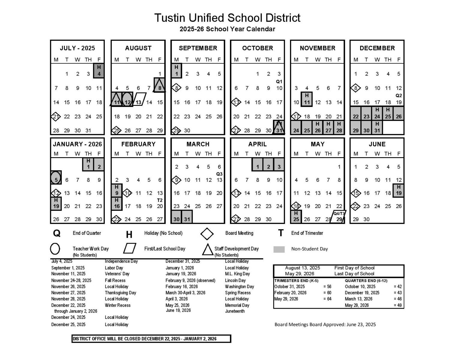 Tustin Unified School District Calendar 2025 2026 in PDF