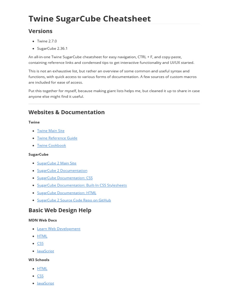 Twine SugarCube Cheatsheet PDF Html World Wide Web