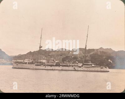 Side view of a twin funnelled two masted vessel anchored close to
