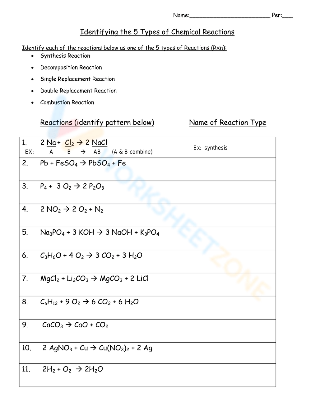 Identifying The 5 Types Of Chemical Reactions Worksheet Worksheets